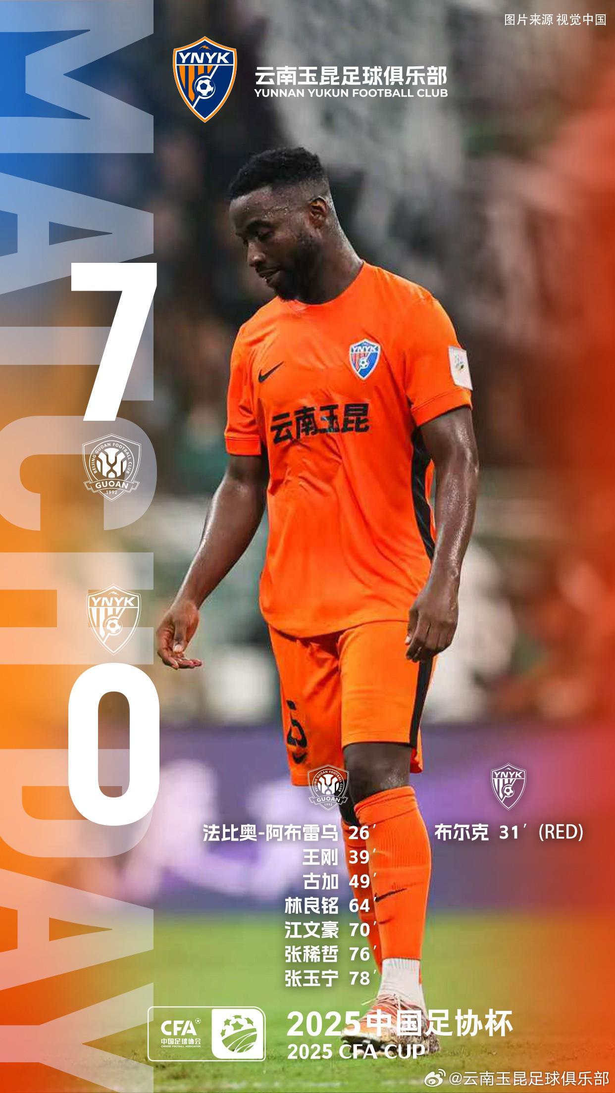 云南玉昆官方写道:“2025中国足协杯半决赛,客场作战的云南玉昆最终以0比7不敌对手。上半场第31分钟,布尔克被红牌罚下彻底改变了比赛的走势。很遗憾,我们没能在今天继续改写云南足球的历史,止步足协杯决赛门外,向所有支持云南玉昆的球迷朋友们说一声抱歉。”